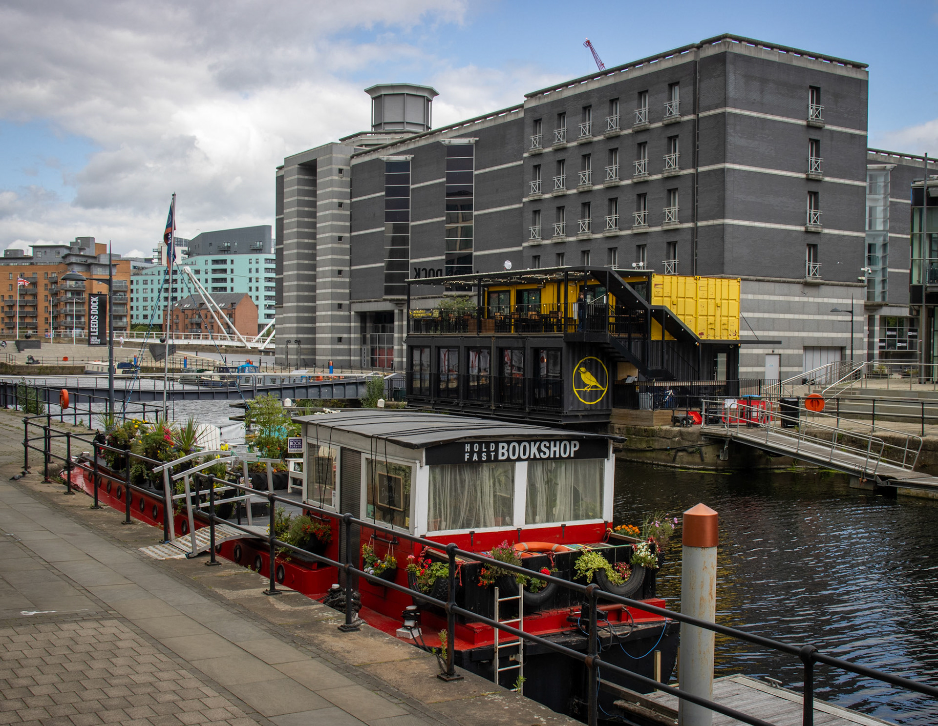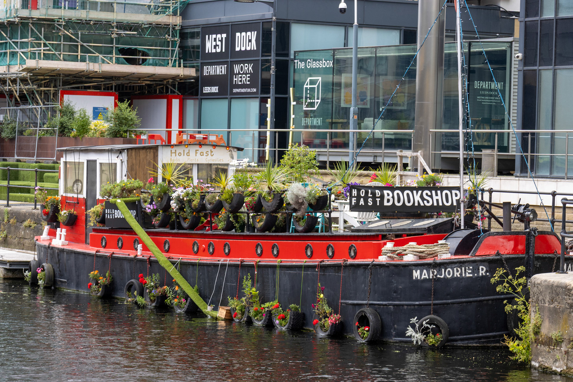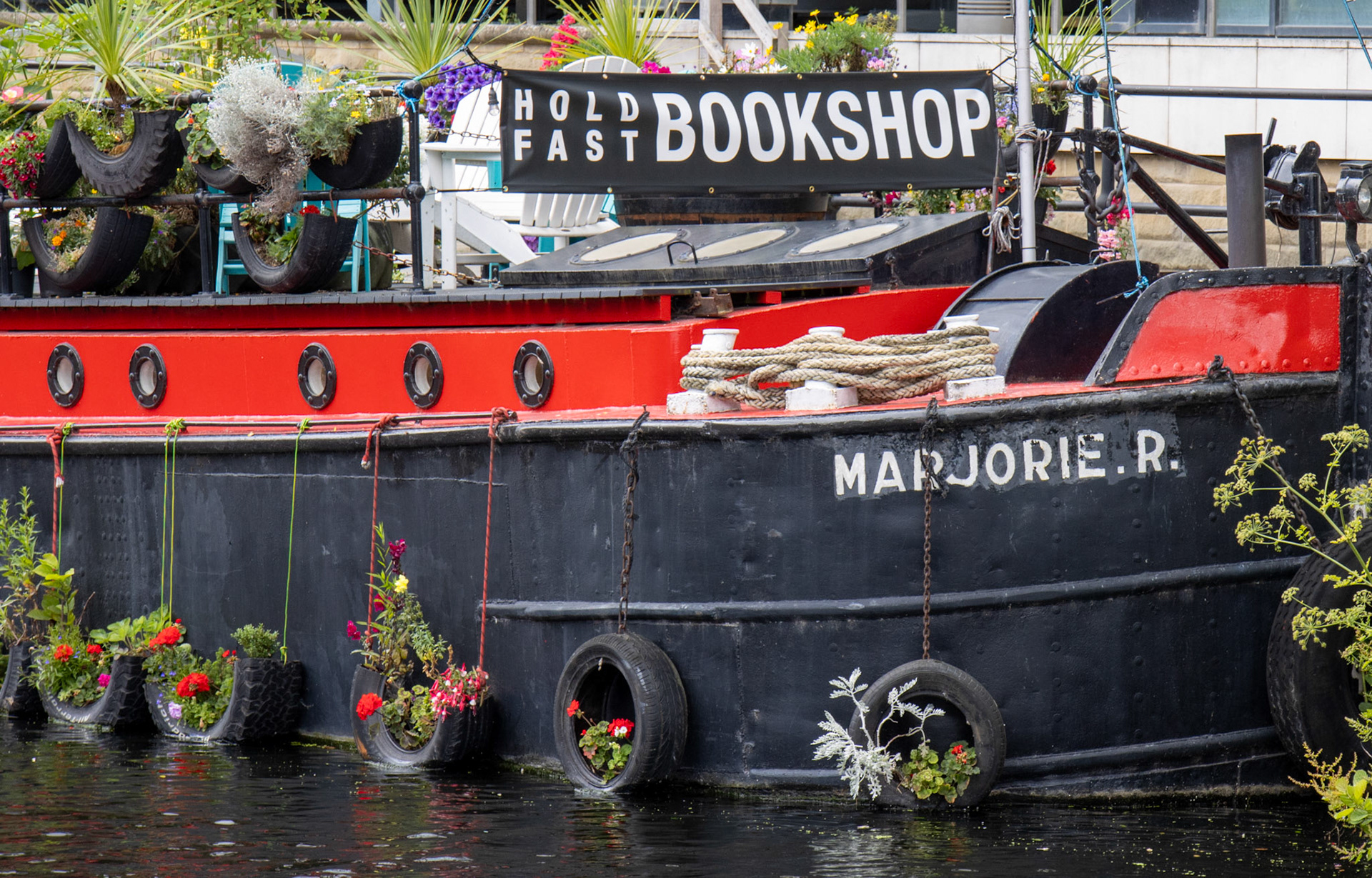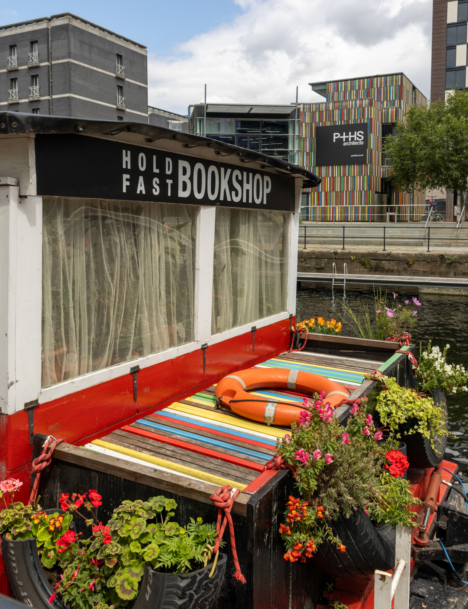 The barge was a burnt-out bare shell when Chris and Victoria Bonner found it abandoned in a boat yard in 2013. Chris and Vic bought and renovated the barge to create the Hold Fast bookshop which opened in November 2022. It is currently moored in Leeds docks. Hold Fast is a welcoming space with an outdoor seating area and brings character to the local area.
