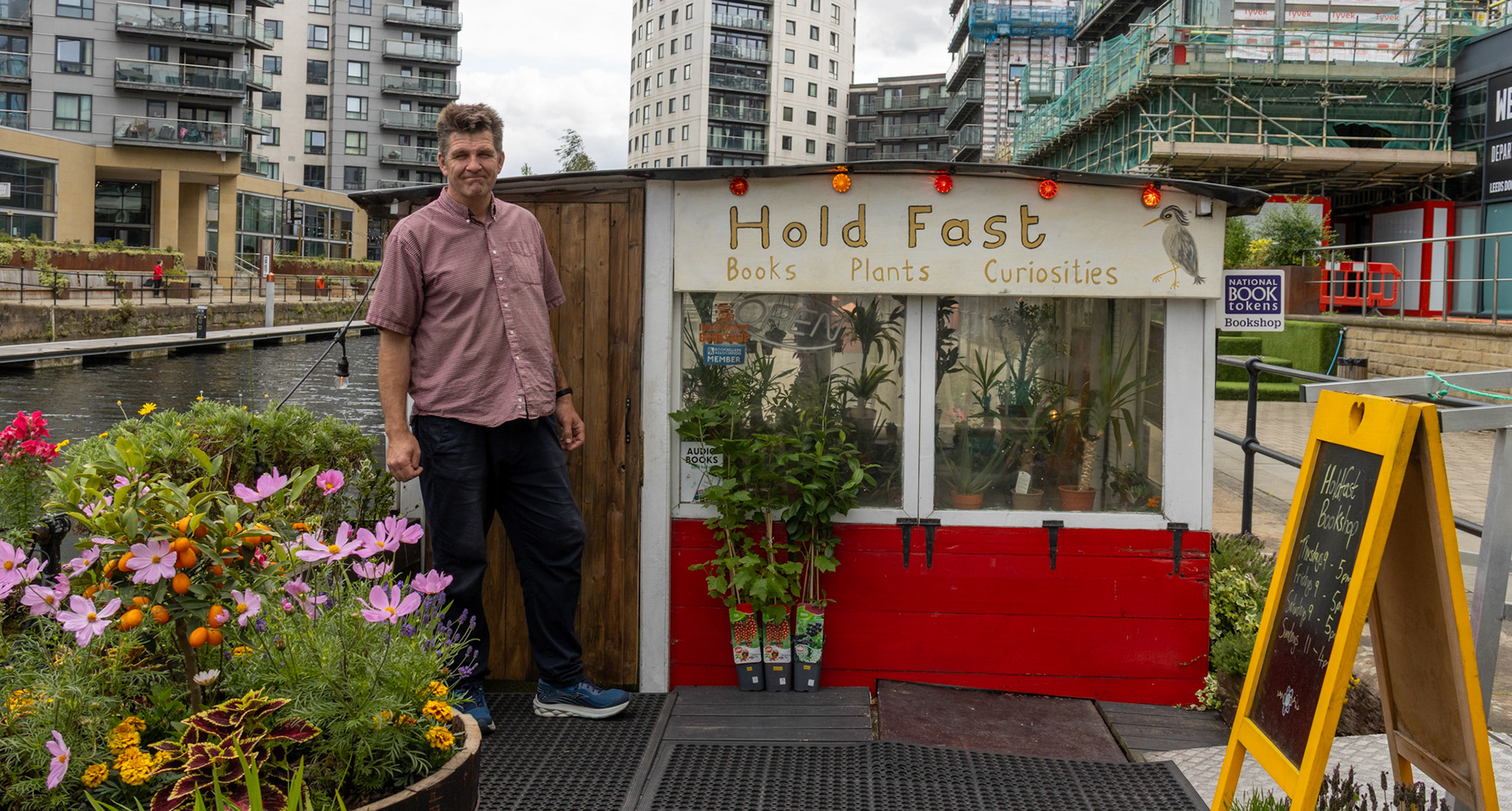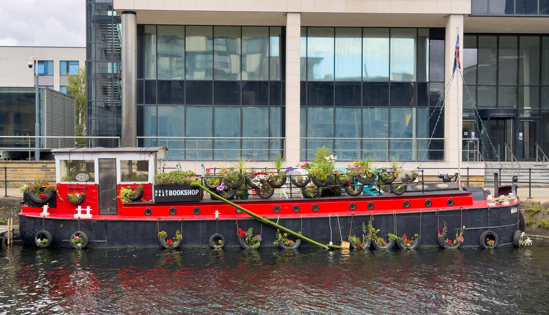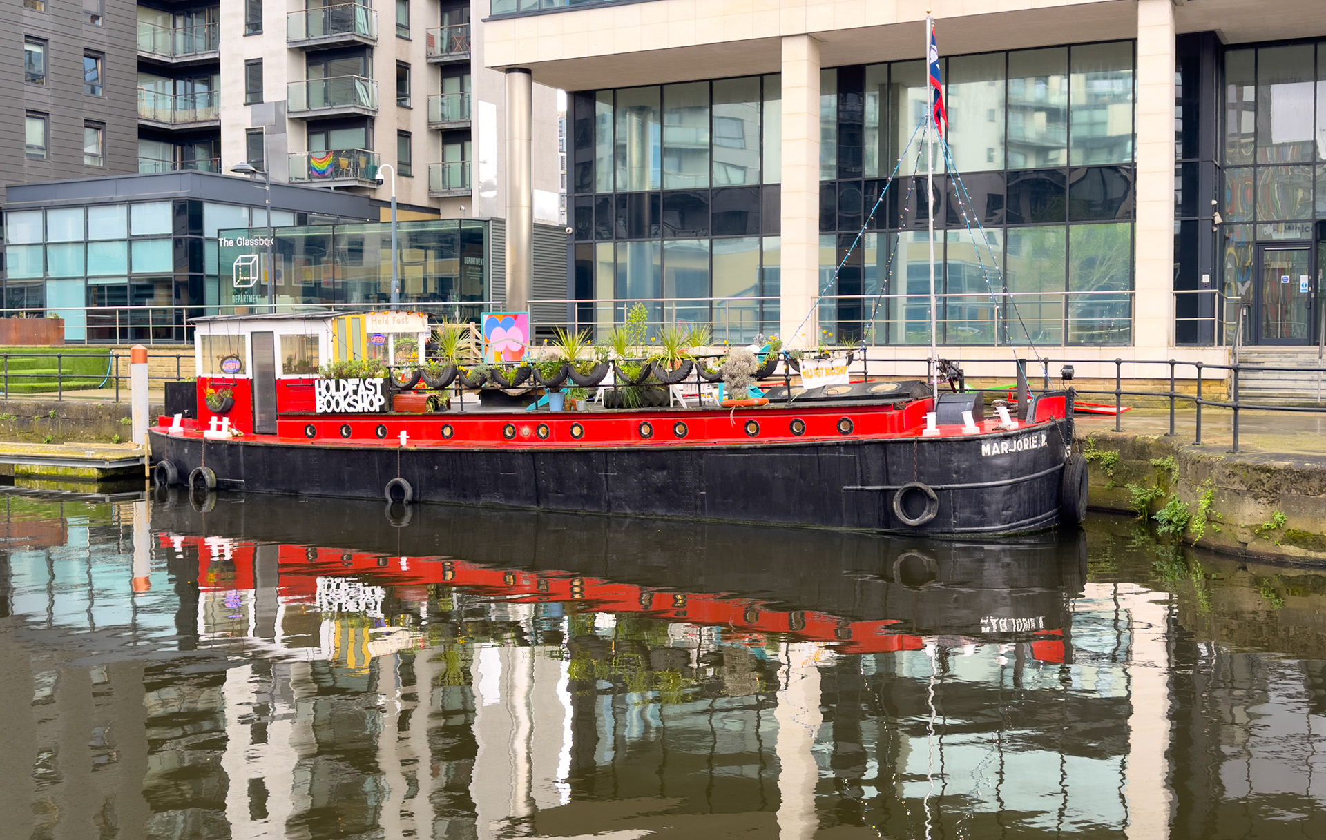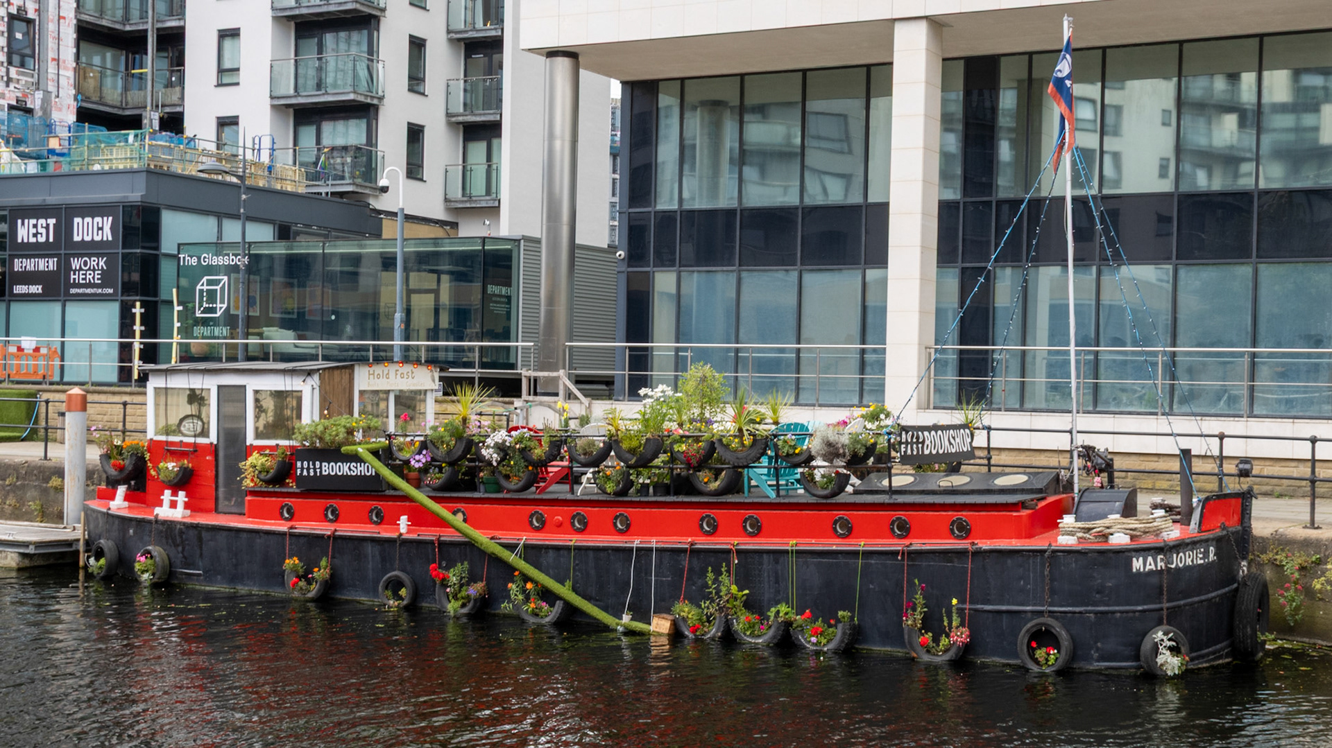 The barge was a burnt-out bare shell when Chris and Victoria Bonner found it abandoned in a boat yard in 2013. Chris and Vic bought and renovated the barge to create the Hold Fast bookshop which opened in November 2022. It is currently moored in Leeds docks. Hold Fast is a welcoming space with an outdoor seating area and brings character to the local area.
