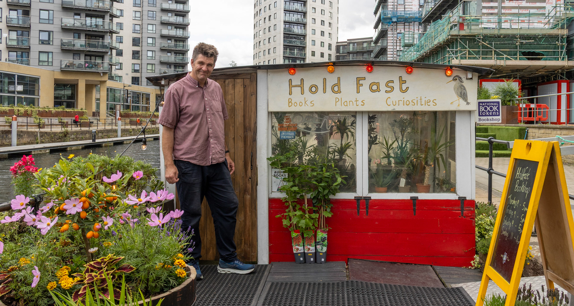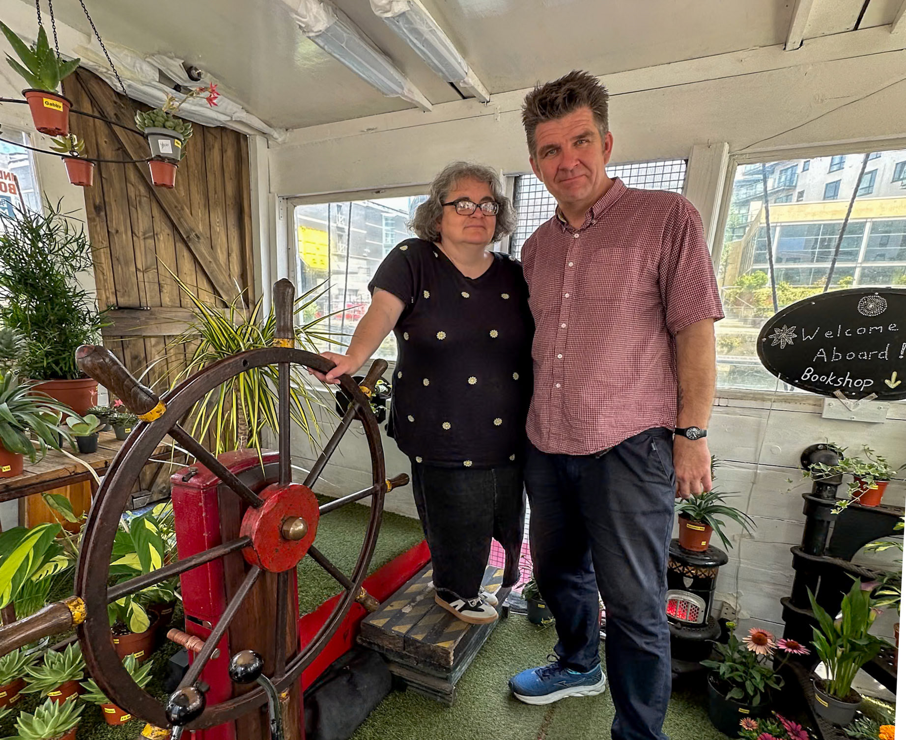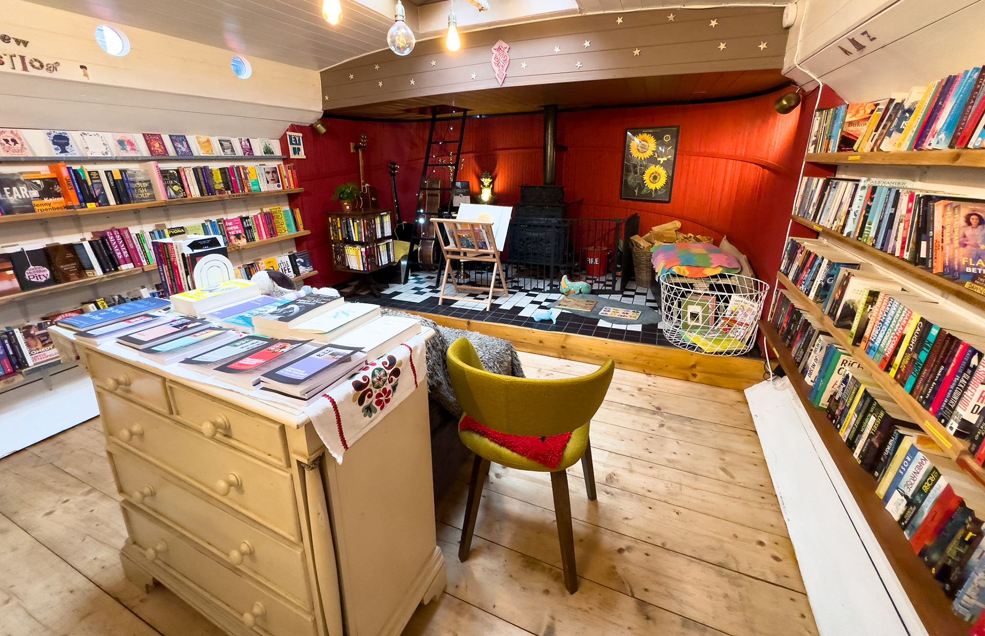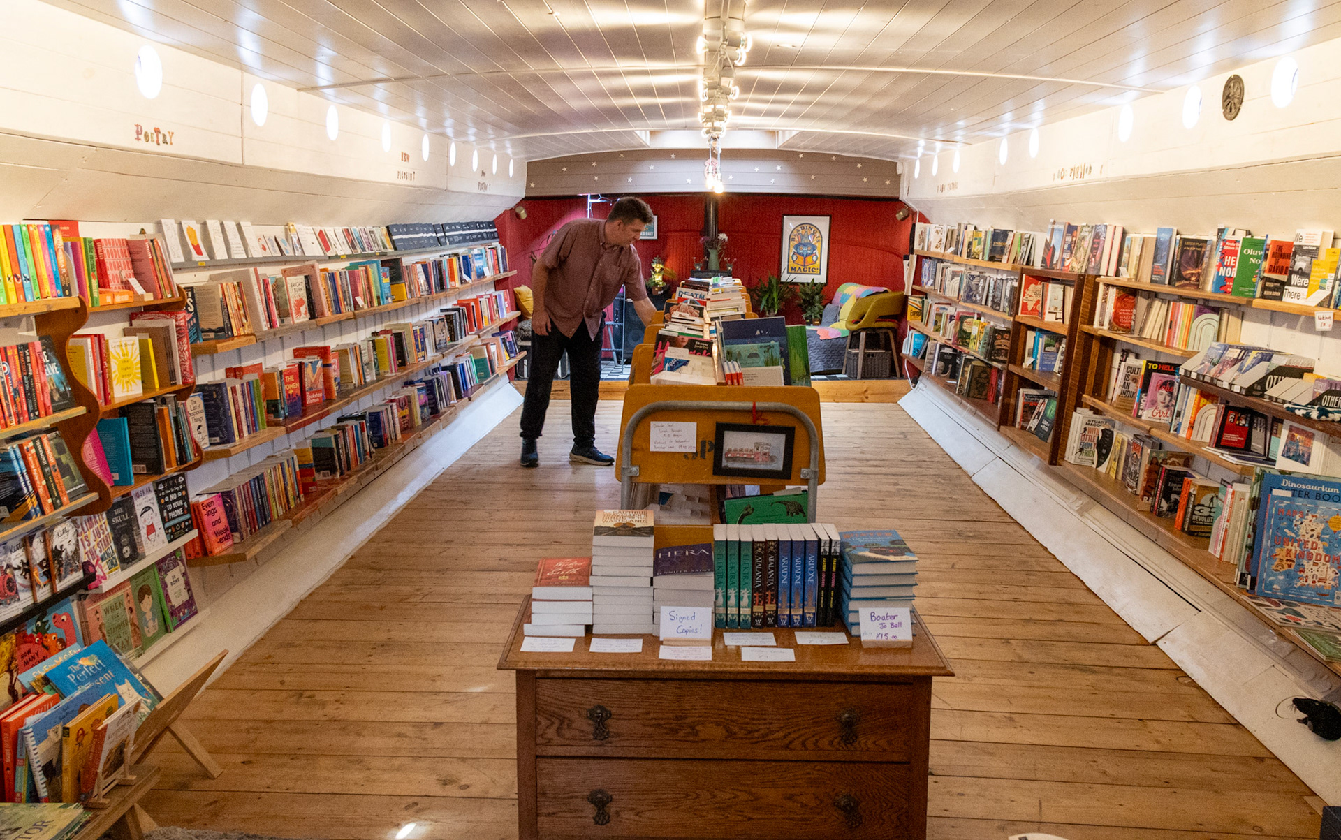 The barge was a burnt-out bare shell when Chris and Victoria Bonner found it abandoned in a boat yard in 2013. Chris and Vic bought and renovated the barge to create the Hold Fast bookshop which opened in November 2022. It is currently moored in Leeds docks. Hold Fast is a welcoming space with an outdoor seating area and brings character to the local area.