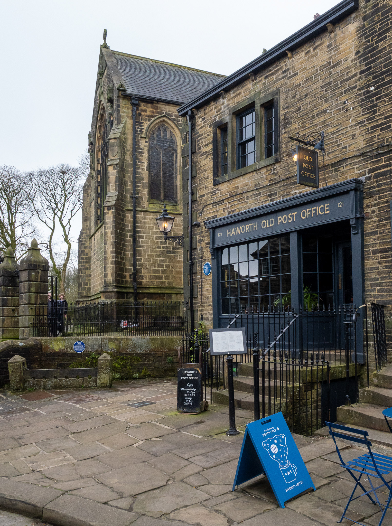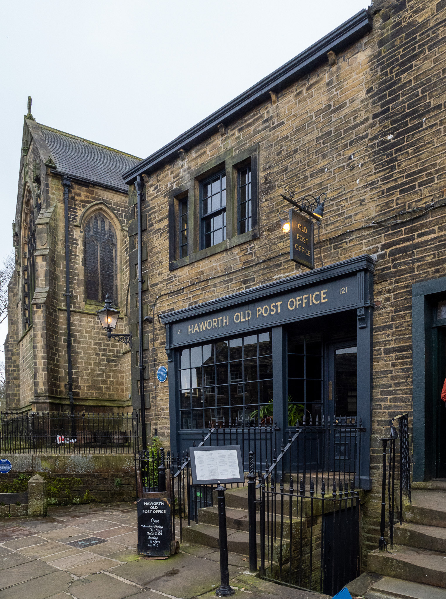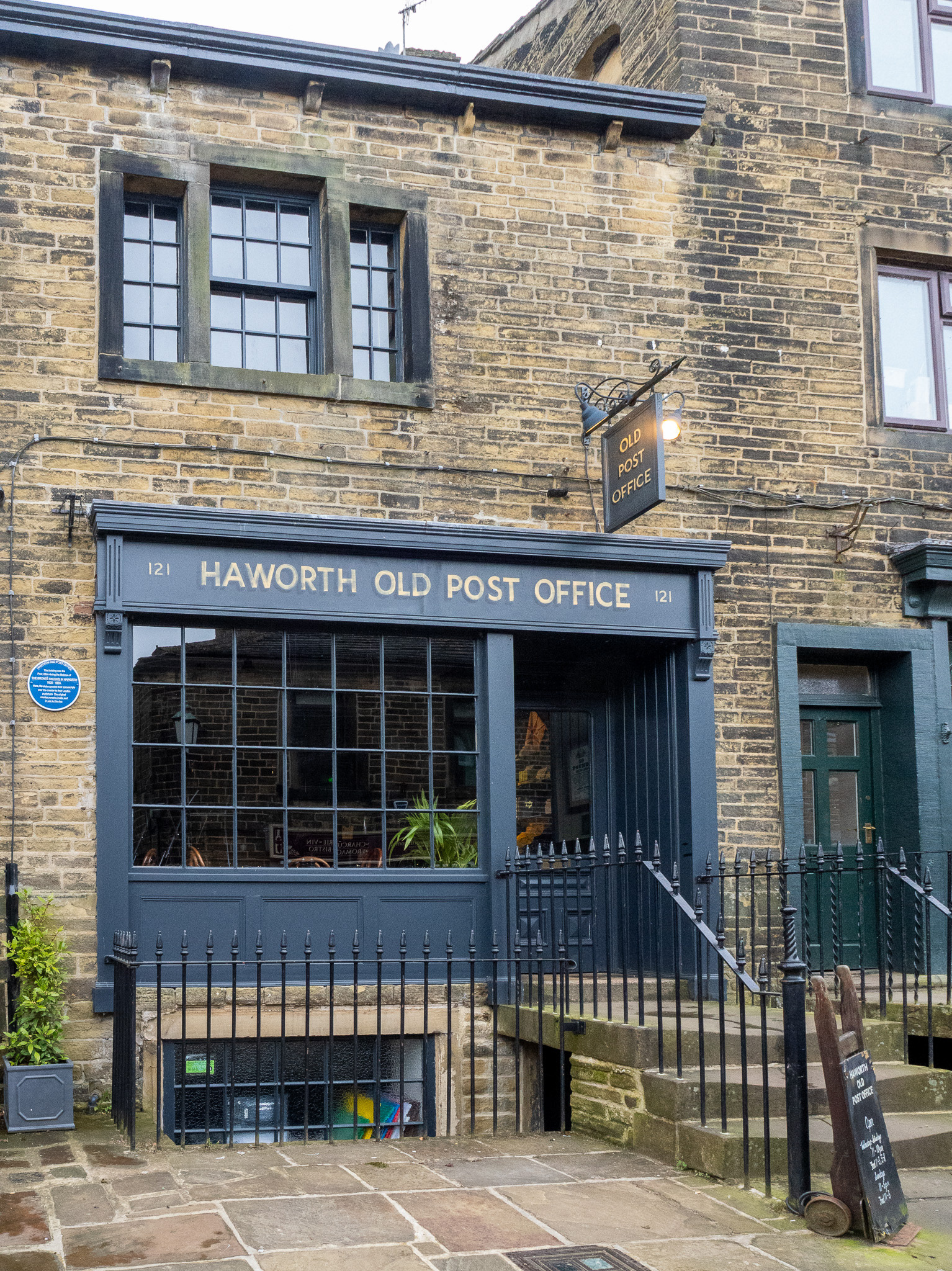 According to the café web site- “Branwell Brontë is said to have stopped at the Post Office on several occasions after over-indulging at The Black Bull. His friend, the Post Master John Hartley, let him sleep in the upstairs back room which, in those days, had a clear view to the parsonage. His sister, Emily, would light a candle in the window of the parsonage when their father, Patrick, had gone to bed, as a signal to Branwell that it was safe to come home.”