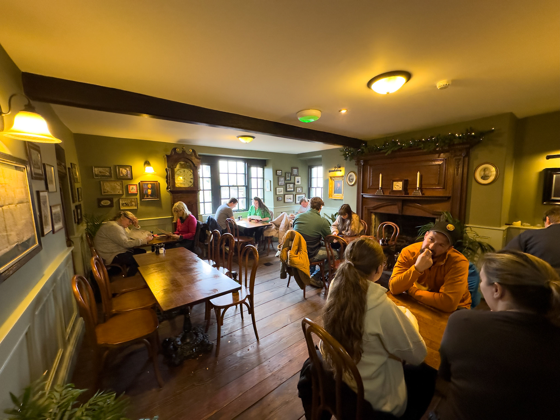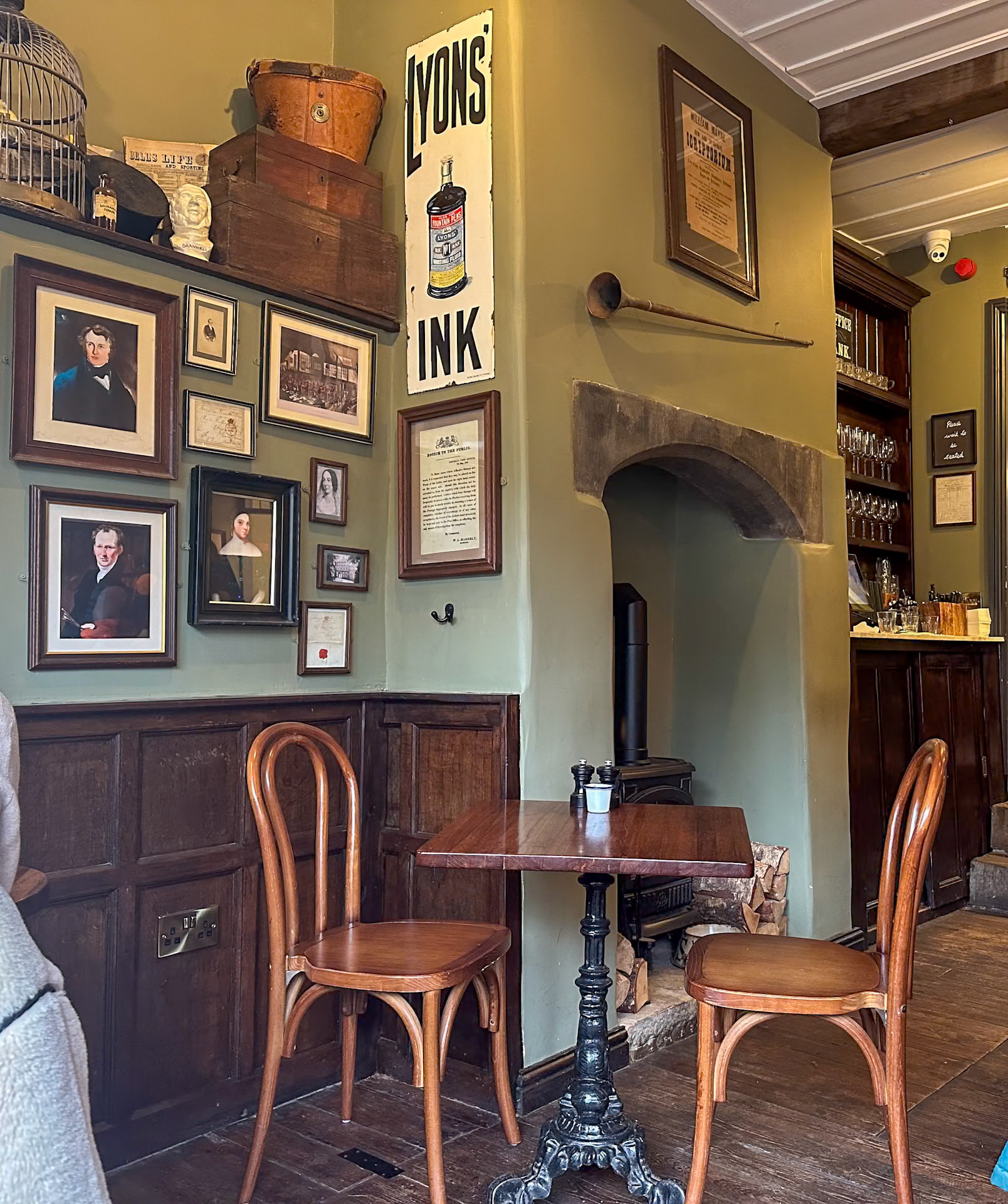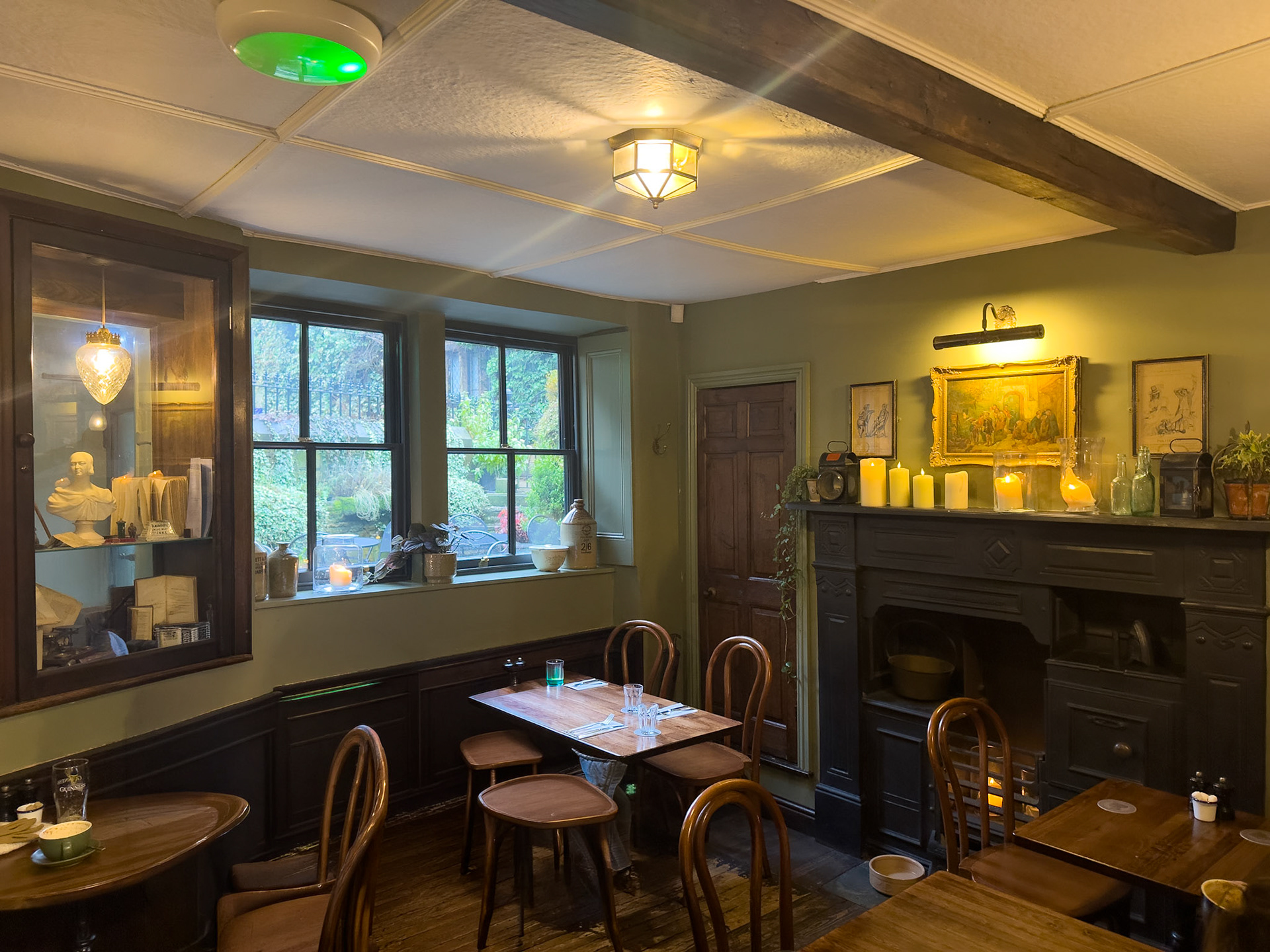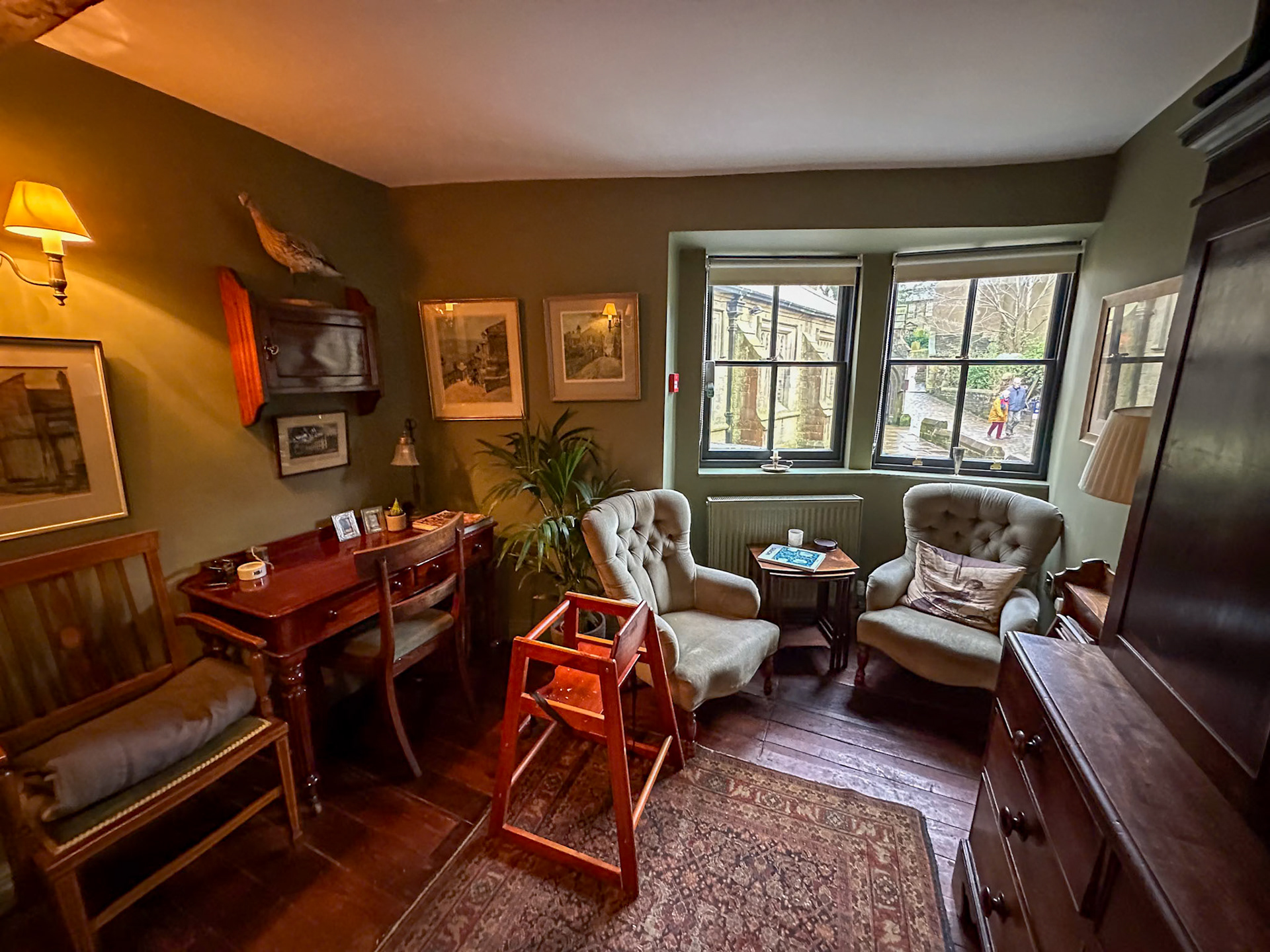 According to the café web site- “Branwell Brontë is said to have stopped at the Post Office on several occasions after over-indulging at The Black Bull. His friend, the Post Master John Hartley, let him sleep in the upstairs back room which, in those days, had a clear view to the parsonage. His sister, Emily, would light a candle in the window of the parsonage when their father, Patrick, had gone to bed, as a signal to Branwell that it was safe to come home.”